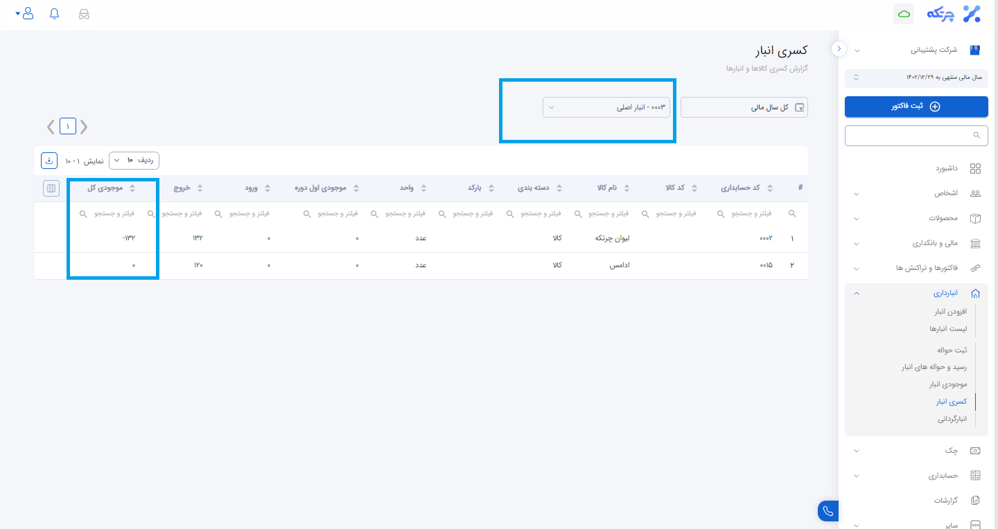 در کسری انبار با انتخاب انبار مربوطه موجودی تعداد کالاهایی که صفر و یا منفی هستند را نمایش می دهد.