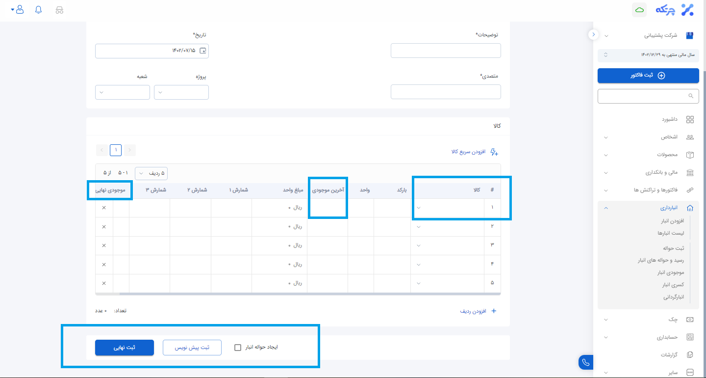 در جدول پایین کالایی که قرار هست برای آن انبار گردانی انجام شود را از لیست انتخاب می کنیم. در سربرگ آخرین موجودی انبار، موجودی نمایش داده می شود. با توجه به شمارش هایی که در انبار انجام شده است می توان آن ها را در کادر مربوطه وارد نمود و نکته ی اصلی در این قسمت وارد کردن موجودی نهایی می باشد. توجه داشته باشید برای مثال اگر آخرین موجودی در نرم افزار 10 عدد باشد و بعد از شمردن در انبار 9 عدد باشد، بعد از ثبت موجودی نهایی، موجودی کل انبار همان عدد 9 را نشان می دهد. در نهایت دو گزینه ثبت پیش نویس و ثبت نهایی وجود دارد که با زدن ثبت نهایی امکان ویرایش انبار گردانی در لیست وجود نخواهد داشت. اما با زدن گزینه ثبت پیش نویش امکان ویرایش یا حذف آن وجود دارد.