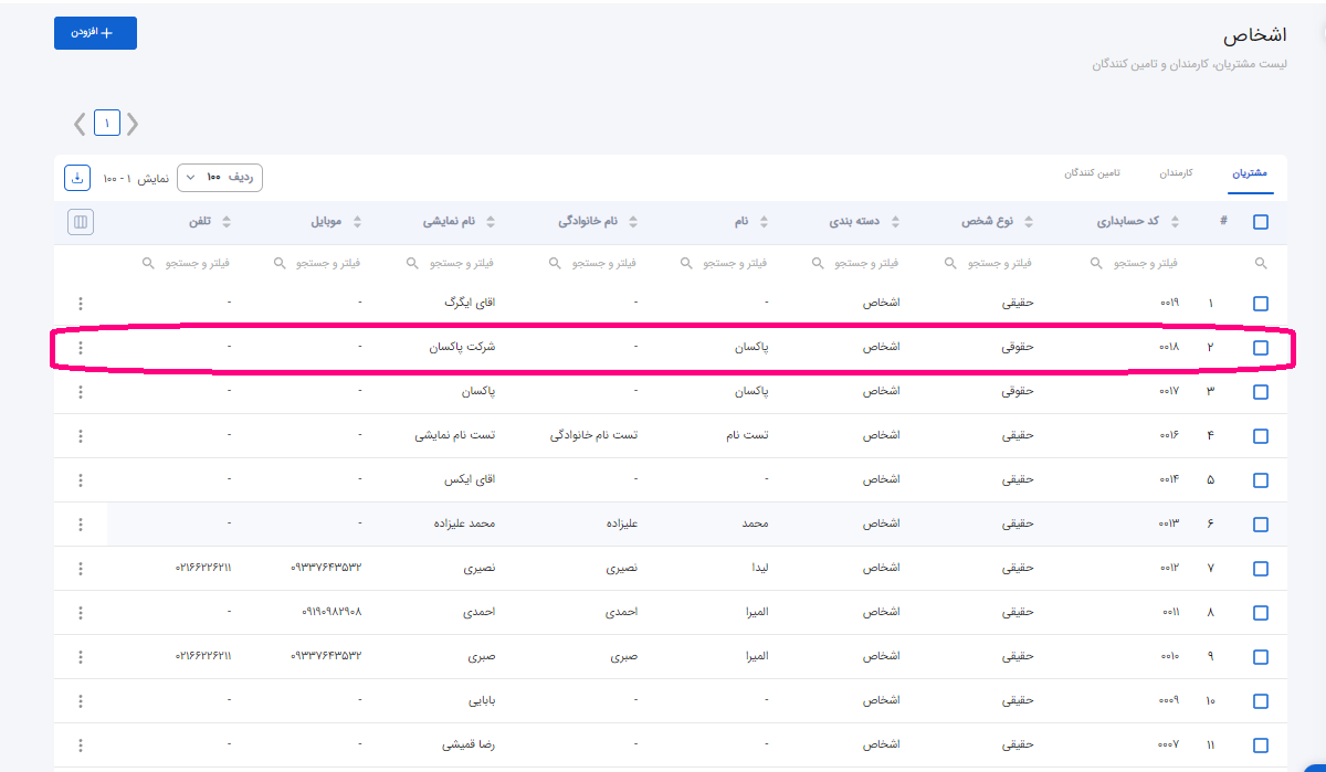 در این صفحه می توانید مشتریان، کارمندان و تامین کنندگان را مشاهده نمایید که از طریق سه نقطه موجود در هر سطر در سمت چپ می توان اطلاع مربوط به آن شخص را ویرایش یا حذف نمود.