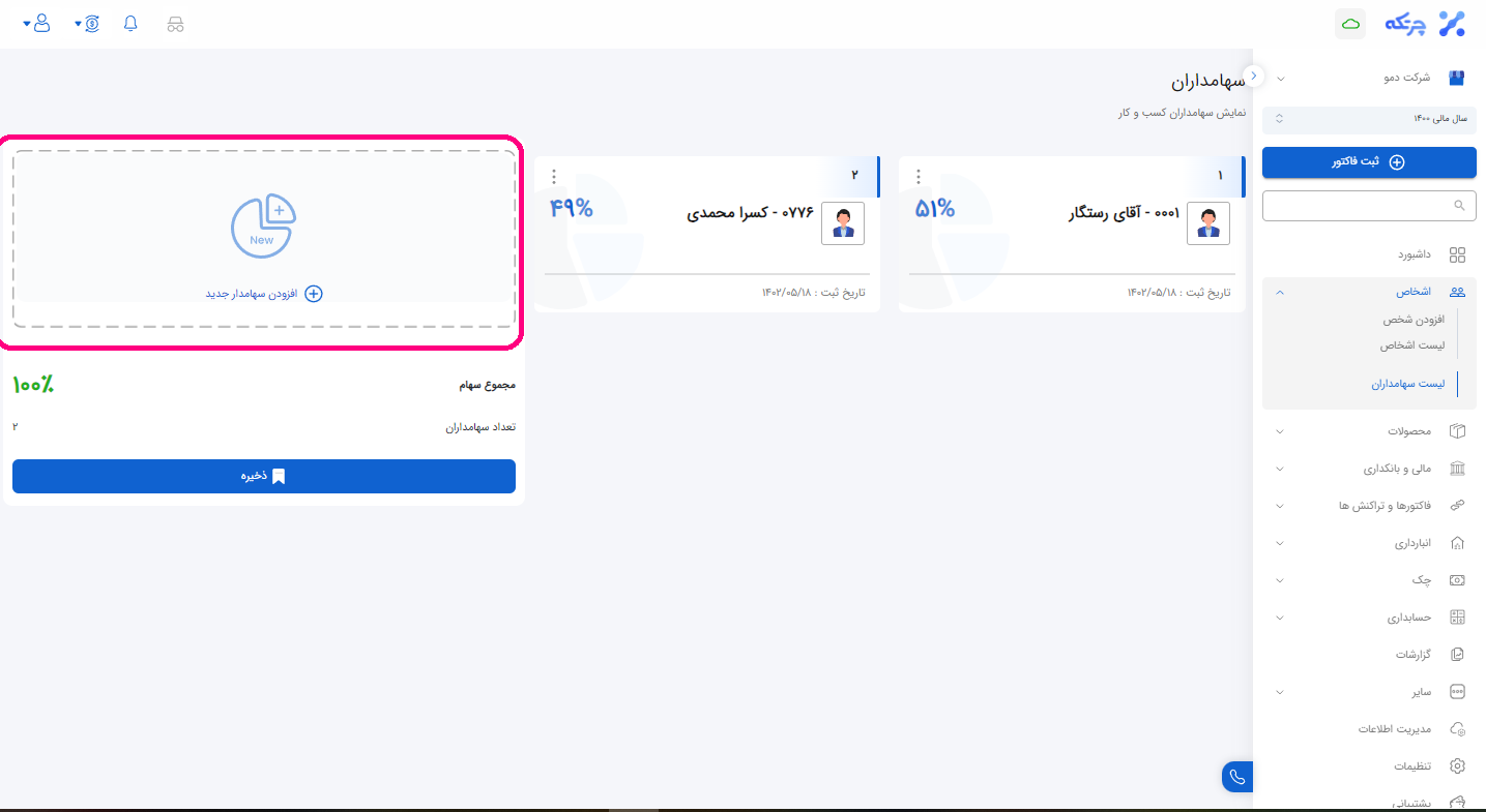 توجه داشته باشید درصد سهام کلی باید عدد 100 را به خود اختصاص داده باشد درغیراینصورت اجازه ذخیره کردن سهامداران وجود ندارد.