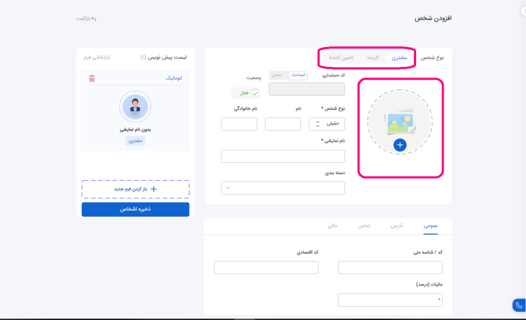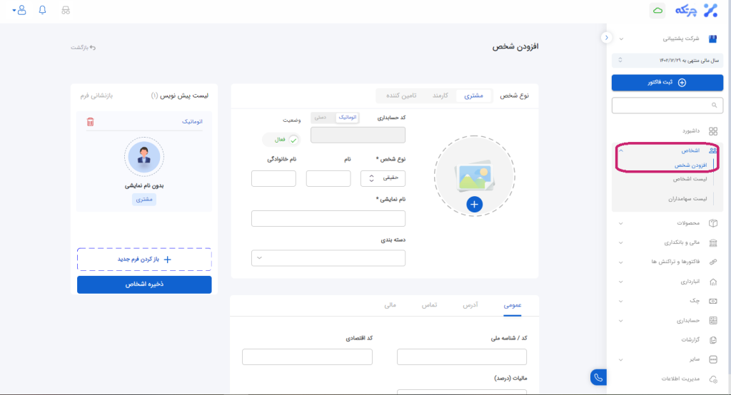با کلیک روی گزینه اشخاص زیر منوی افزودن شخص را انتخاب کرده و یک شخص جدید اضافه می کنید.