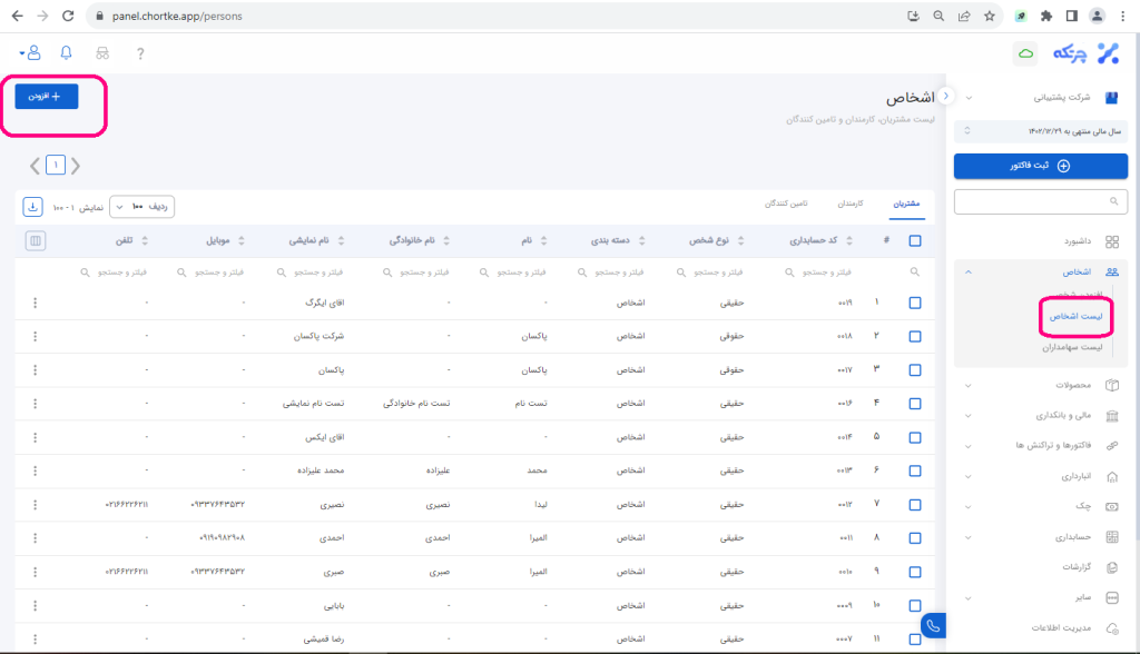 همچنین لیست اشخاص از منوی اشخاص > لیست اشخاص قابل دسترس است.